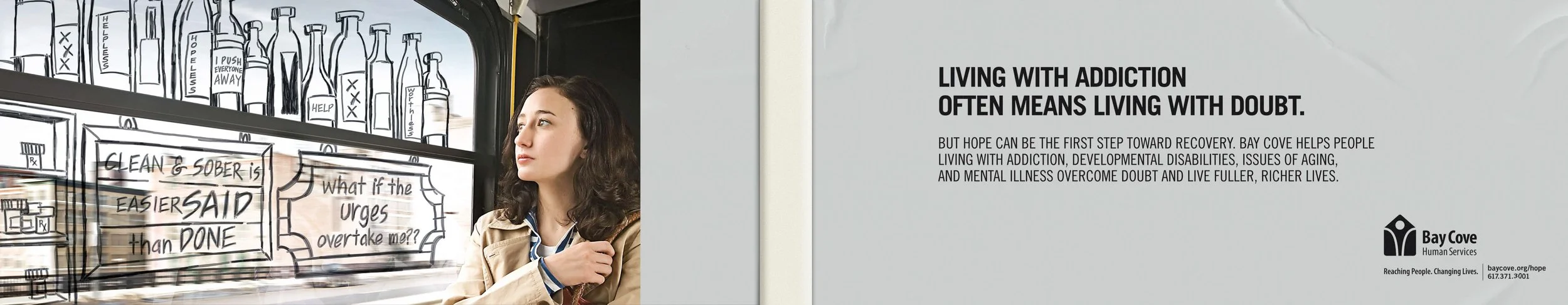 OOH β’ PRINT β’ Transit // Baycove helps help more than 25,000 adults, children and families in Southeastern Massachusetts thrive with major life challenges like; mental illness, developmental disabilities, homelessness, substance use disorders, and difficulties associated with aging. Writer: Natasha OβRourke